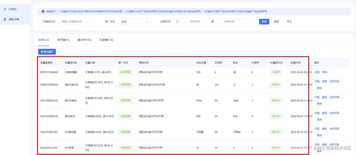 下面可以看到优惠券编号、优惠券名称、优惠内容、推广方式、用券时间、发放总量、已领取、剩余、已使用、优惠券状态、创建时间等,如下图所示: