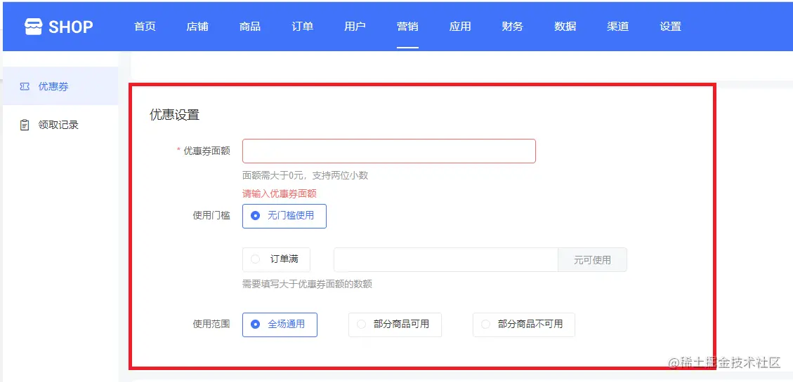 营销中心中的优惠券中有优惠券和领取记录,点击优惠券,如下图所示:
