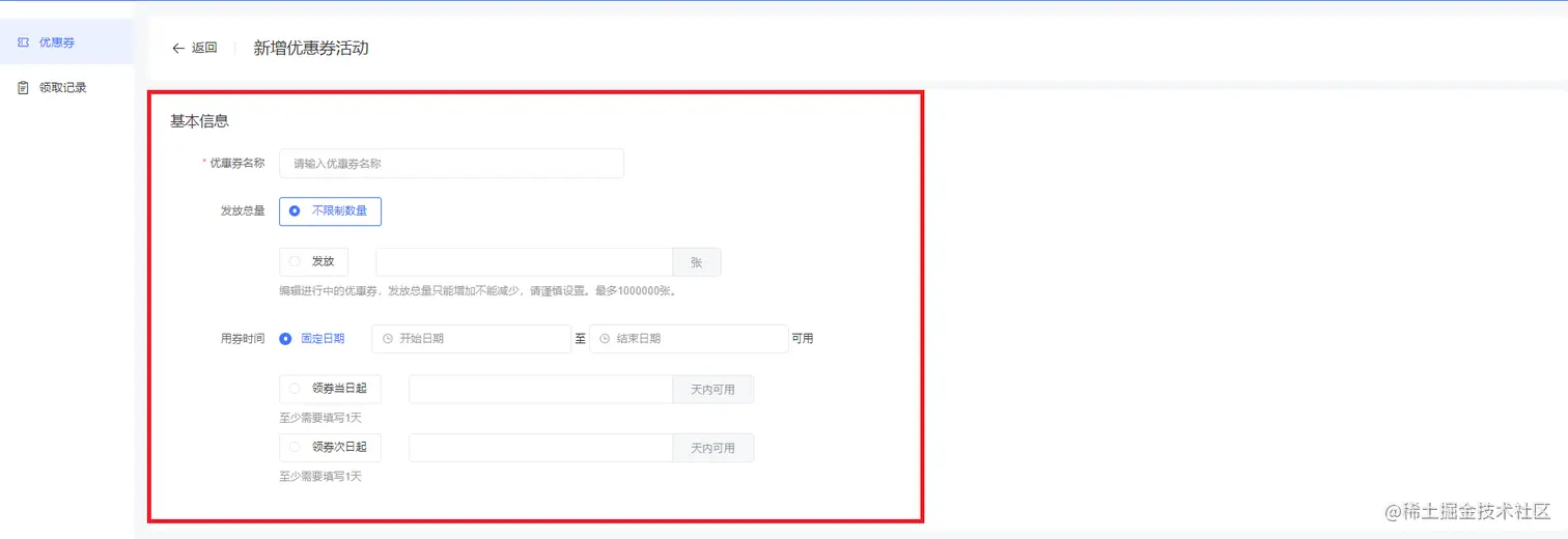 点击新增优惠券,输入优惠券名称、发放总数(编辑进行中的优惠券,发放总量只能增加不能减少)、用券时间等基本信息