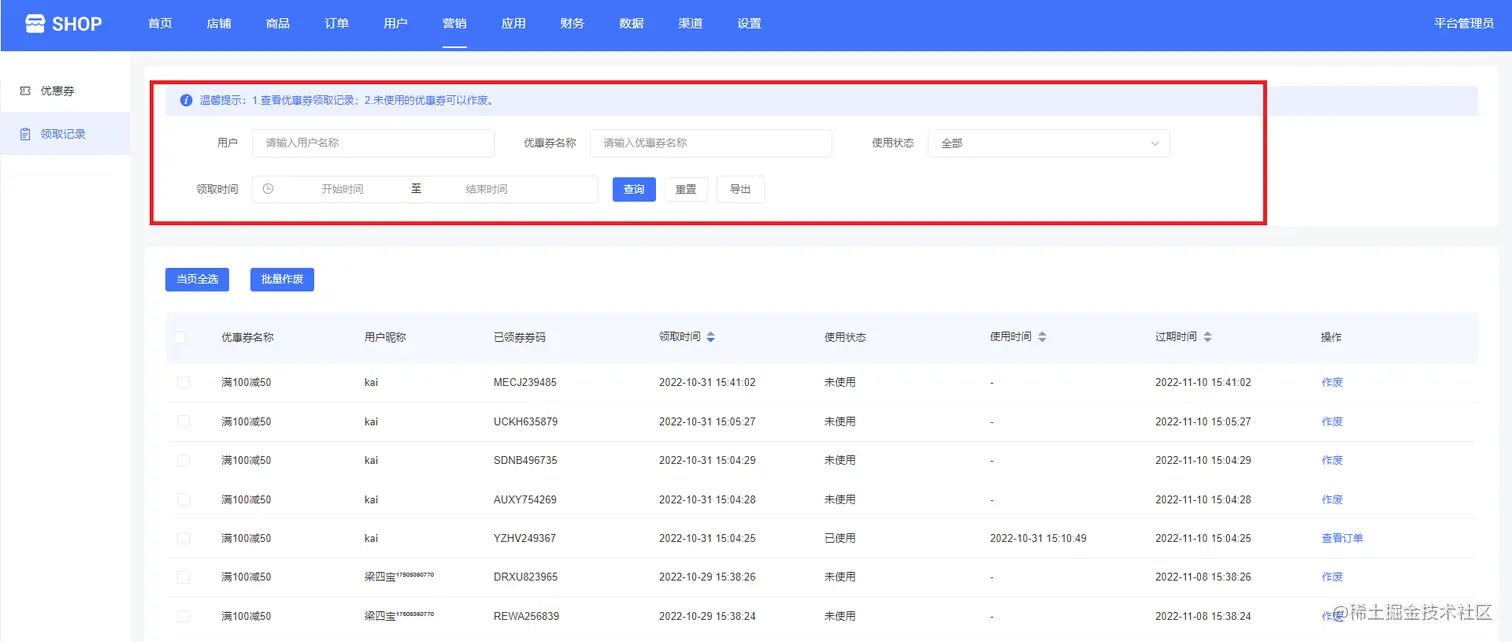 点击领取记录,平台管理可以通过输入用户名称、优惠券名称、使用状态(未使用、已使用、已过期、已作废)、领取时间等,查看优惠券领取记录,如下图所示: