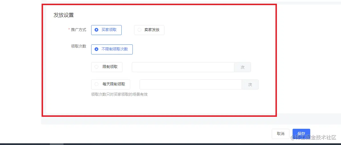 选择推广方式、领取次数(不限制领取次数、限制领取、每天限制领取)等发放设置,如下图所示: