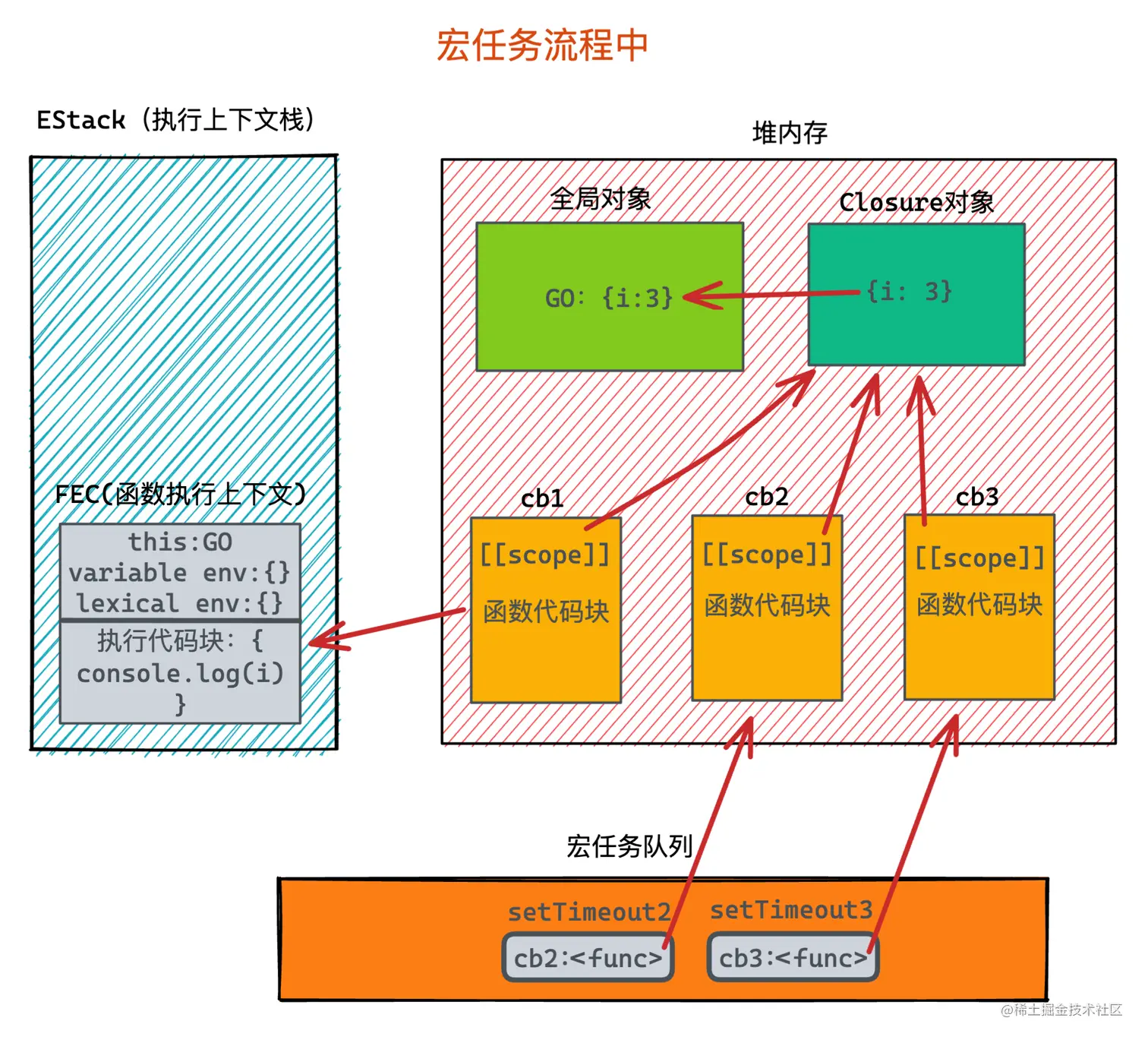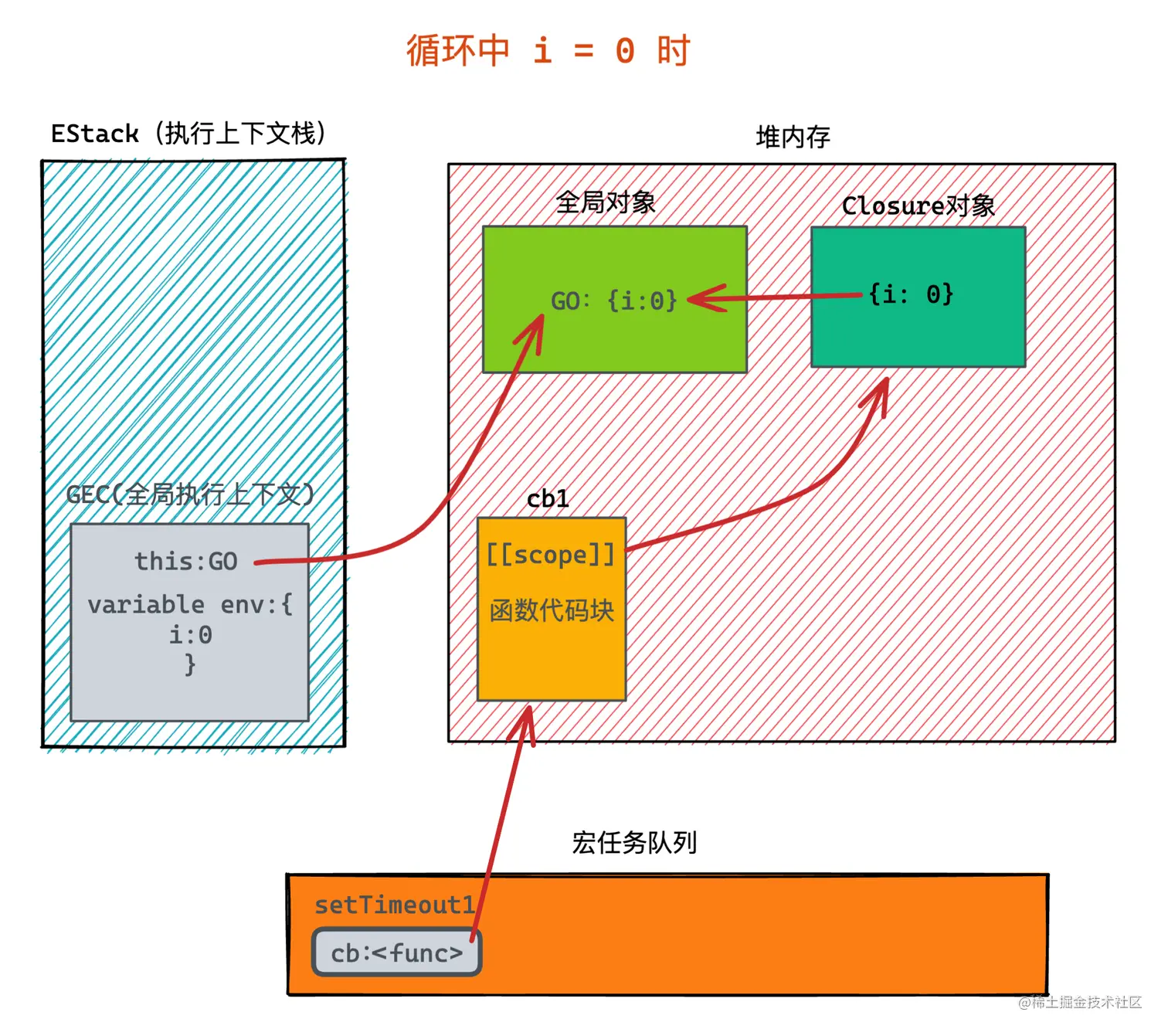 然后开始进行循环, 当 i = 0时,第一个定时器被丢入宏任务队列,关于宏任务相关的内容属于事件循环范畴,暂时只需要理解setTimeout会被丢入队列里,等之后执行。 此时在堆内存中会创建它的回调函数cb,并且函数创建时会创建[[scope]],在实际ECMA的规则中,[[scope]]会指向该函数的父作用域,也就是当前的全局对象(作用域是概念上的东西,实际体现在内存中就是保存数据的一种结构,可能是对象也可能是其他)。 但是在V8引擎的实现中,其实并不会指向全局对象,而是去分析该函数使用了父作用域中的哪些变量,将这些变量存储到Closure中,然后由scope指向。每个函数都有且只有一个Closure对象。