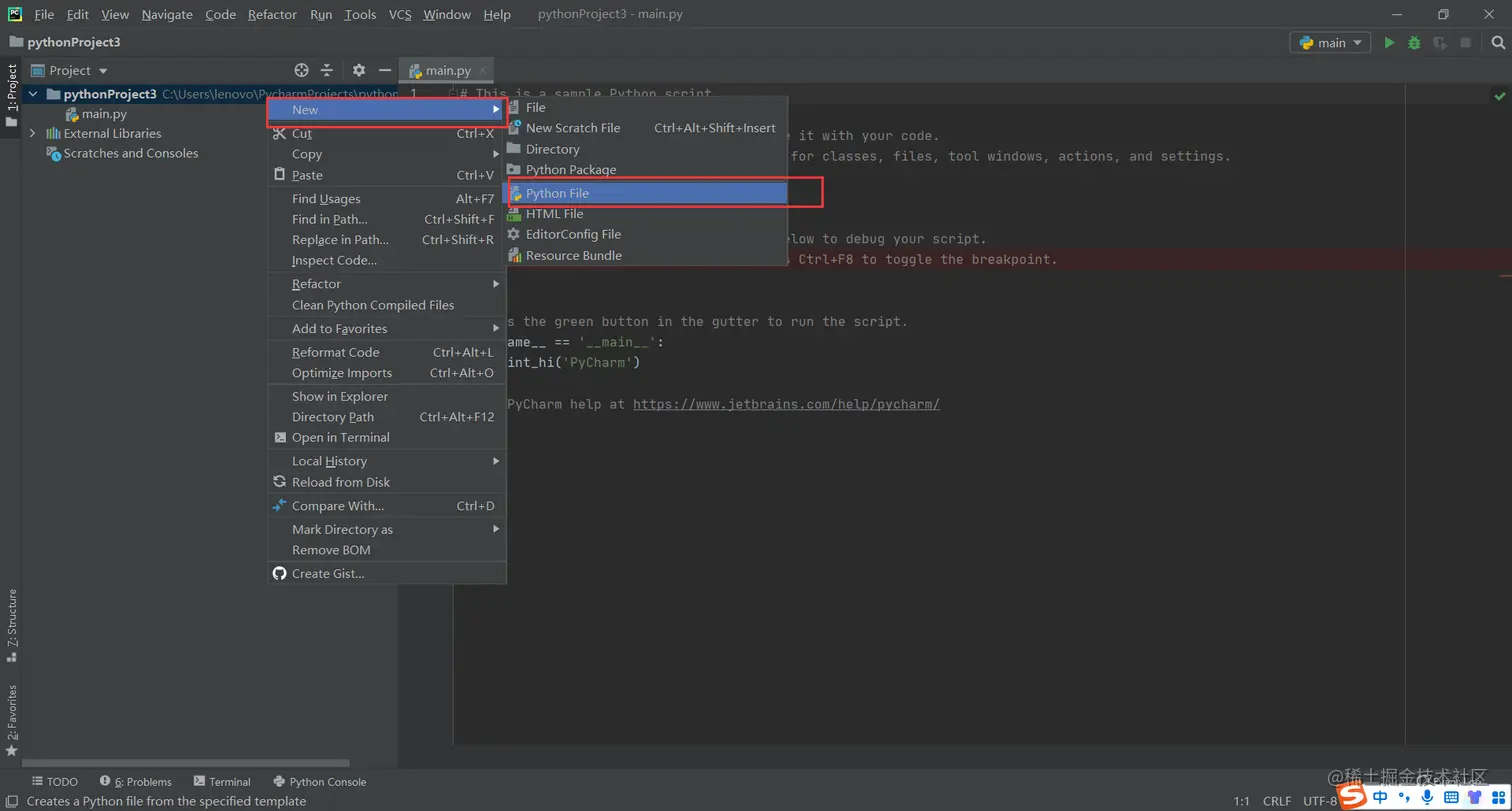 进入项目之后右键项目,选择new,创建pythonFile,输入文件名