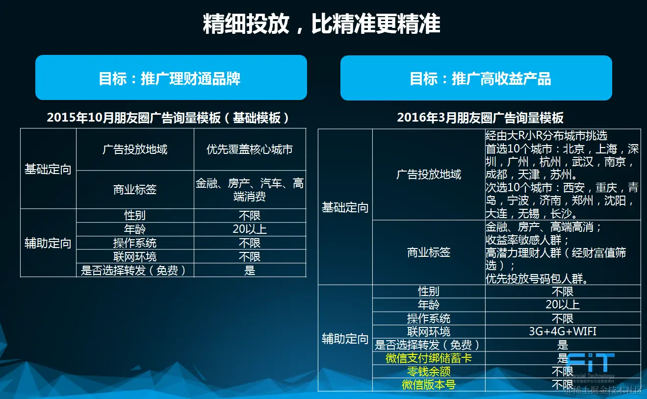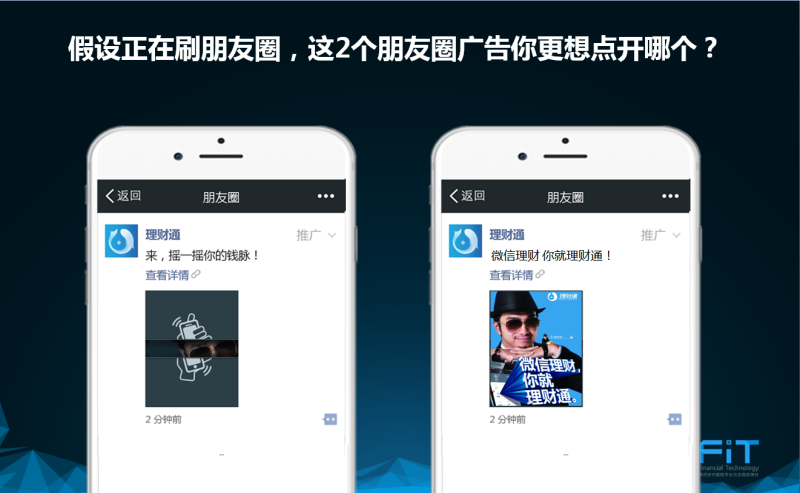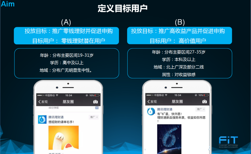 有了明确的目标后,接下来是定义目标用户。以下的例子是理财通的实例:(A)和(B)两个朋友圈广告是为了不同的推广目的而制作的。