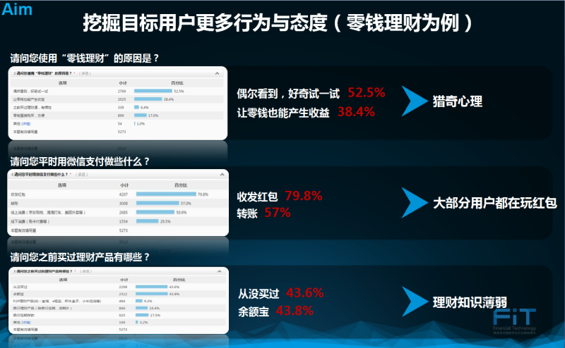 三个方面去研究现有用户的行为和态度。随后,发现零钱理财的目标用户具有“猎奇心理”、“大部分用户都在玩红包”、“理财知识薄弱”三个特点。