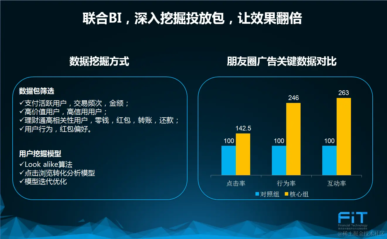 除了常规SPA基础投放以外,通过数据挖掘,提供号码包,使我们可以通过每次投放精准触达目标用户。在实际的操作过程中,号码包(核心组)在“点击率”,“行为率”,“互动率”三大维度上全面优于由基础定向普通包(对照组)。