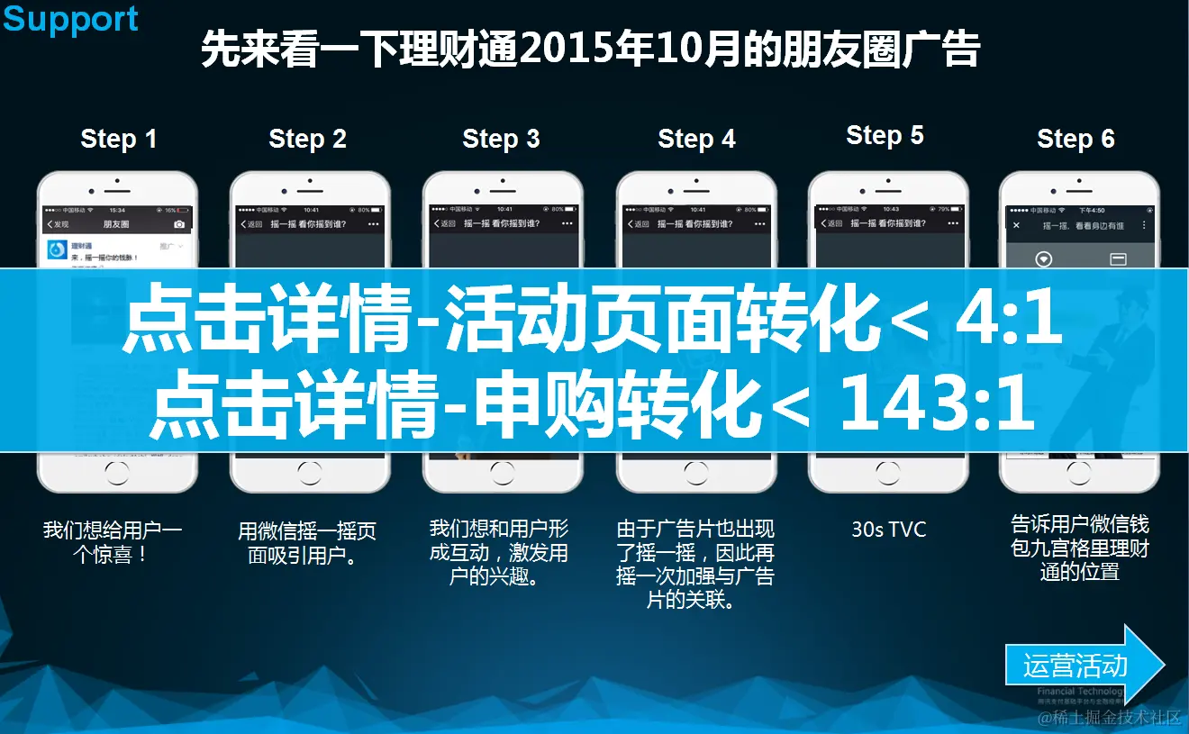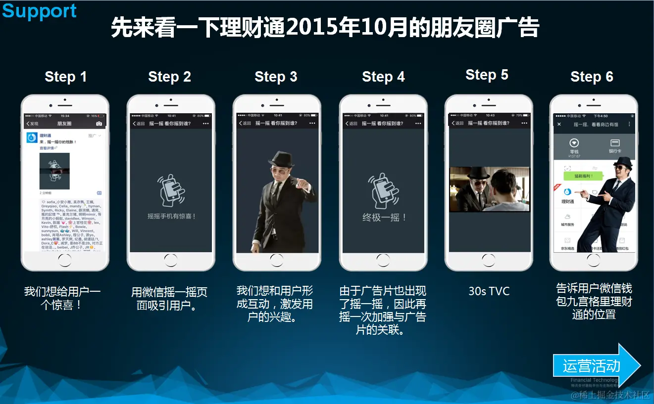 这里我以2015年10月理财通投放的“黑衣人”朋友圈广告为例,当时仅有图文广告,目的是为了曝光广告片并且落地到运营活动。 体验流程上从外层到运营活动一共经历7个步骤,每一个步骤的设计都经过了我们深刻的考虑。如下: