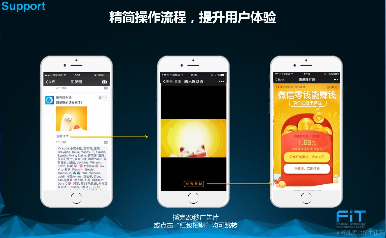 - 对于用户的微信支付行为,我们发现大部分用户都在使用红包,因此广告从内容到最后的落地,都使用“红包”贯穿始终,一气呵成。包括在广告片下方加入“红包招财”的按钮。