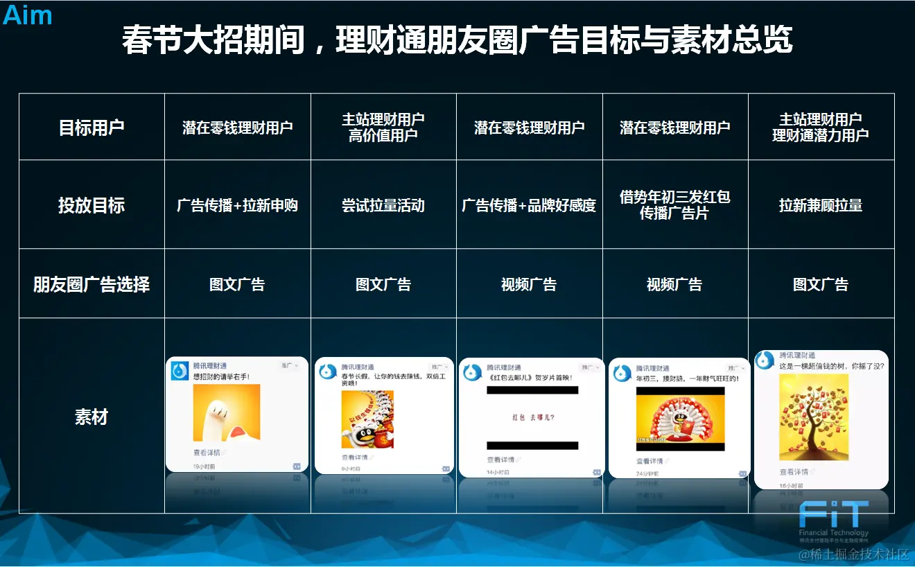 最后,强烈建议需要投朋友圈广告的各位,根据AIM的要点,踏实做好规划。下面是理财通春节期间的素材总览表: