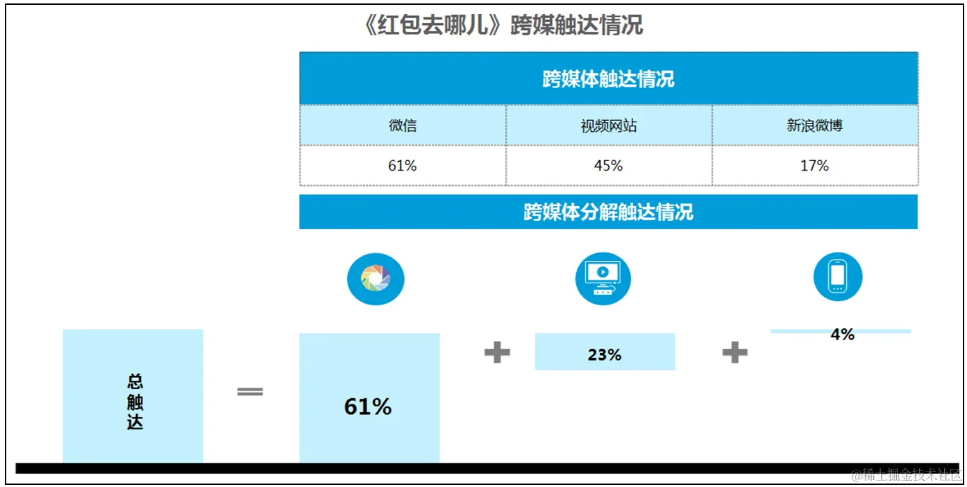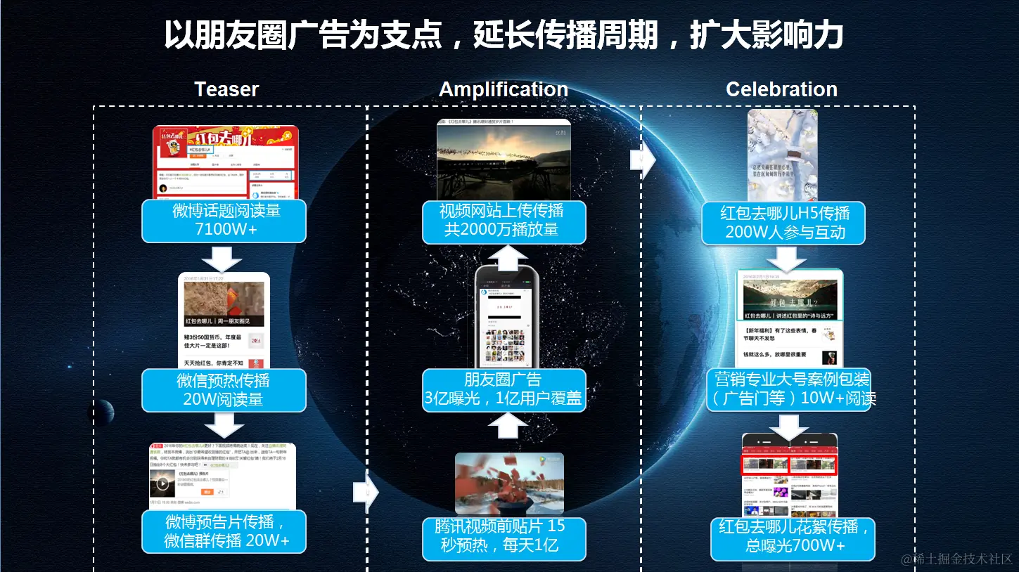 - Amplification: 2月1日朋友圈广告上映的同时,除了朋友圈广告本身具有3亿曝光量和1亿用户覆盖外。联合腾讯视频,在腾讯视频上同步播放红包去哪儿广告15秒预热视频,每天1亿次曝光。同时在所有视频网站均上传“红包去哪儿”视频,获得2000万播放量。