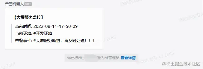 将项目后台服务断掉,五分钟后,企业微信收到消息通知。可见,脚本及定时任务均正常运行。
