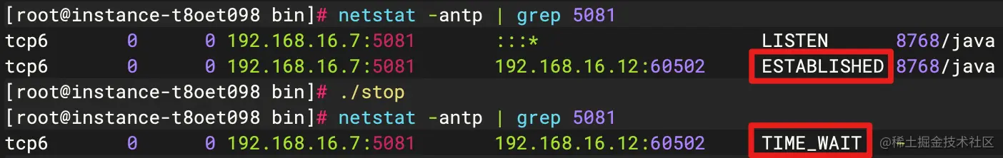 5081为后台服务本地端口,其与网关之间建立连接后,正常连接下,监听状态为“ESTABLISHED”;异常连接时,监听状态为“TIME_WAIT”。因此可以通过判断监听状态来判断服务的连接情况。