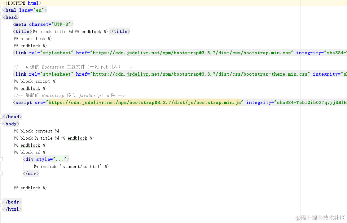 咱说的爸爸就是主模板,儿子是子模版。子模版继承主模板的关键字是extends,在主模板中,我们要挖坑,看上图,{% block name %}{% endblock %},这个的name说的是标签名。这个标签名一定要有意义。这样在后续的开发中才会见名识意。