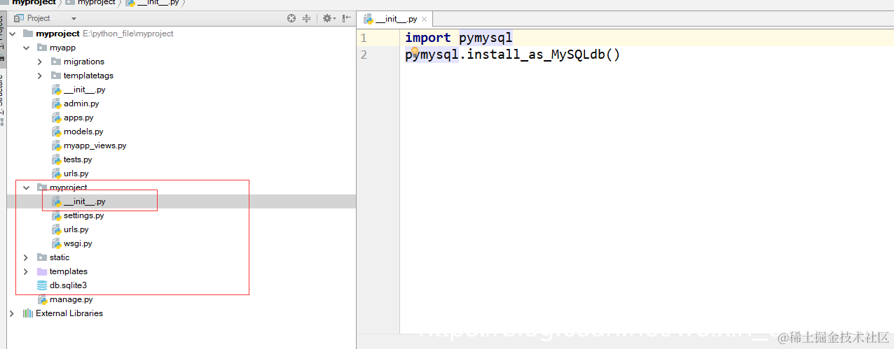 第二步,在项目的根配置文件__init__.py文件中写入MySQL。看下图: