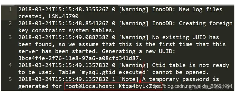 前几行都是一些正常的警告信息。最后一行是关键,也写的很清楚了,密码就在最后。我的这个就是Ktqa4byL<Z:<。这个密码不能直接使用,比如,用navicat等登录会提示的.