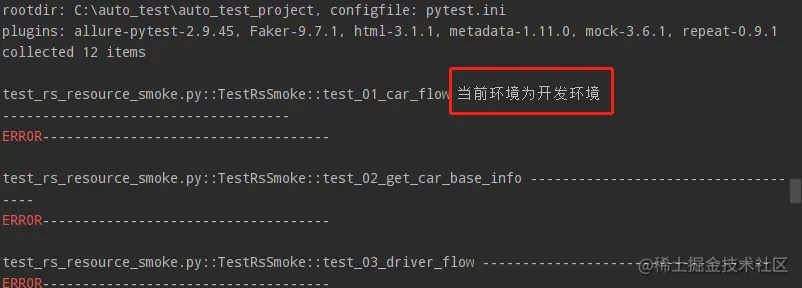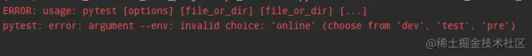 - --env:前面pytest_addoption定义的命令行参数,默认值:test,输入范围choices=["dev", "test", "pre"]