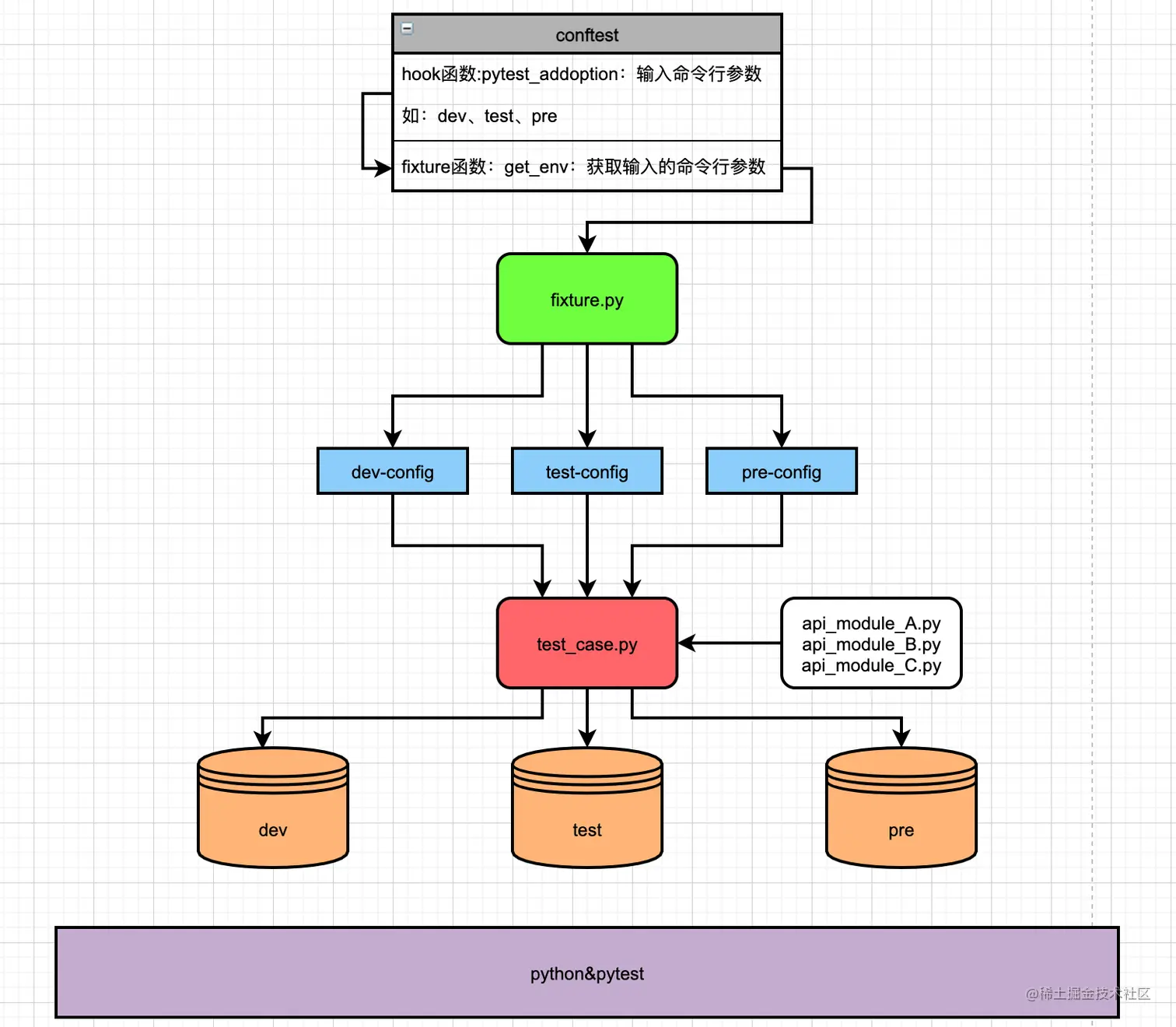 - conftest.py:存放一些hook函数、全局fixture函数,如前面提到的自定义命令行参数的函数pytest_addoption、获取命令行参数的fixture函数get_env;
