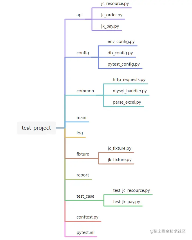 项目结构大致如下,至于目录结构和文件命名,只能说萝卜青菜各有所爱。比如有人喜欢把存放公共方法的common目录命名为utils,存放各个api模块的api目录命名为src......