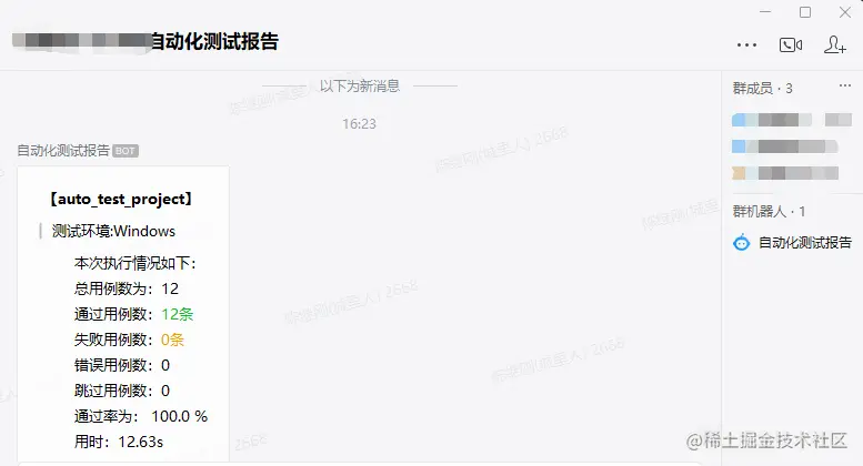 同时,测试结果发送到企业微信群,关于自动化测试结果自动发送企业微信的实现思路,可参考前面分享过的一篇文章《利用pytest hook函数实现自动化测试结果推送企业微信 》