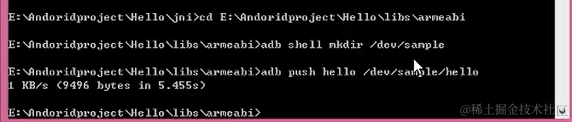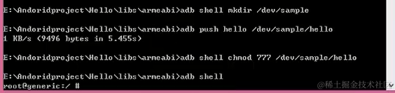 adb shell chmod 777 /dev/sample/hello //使hello程序具有可执行权限