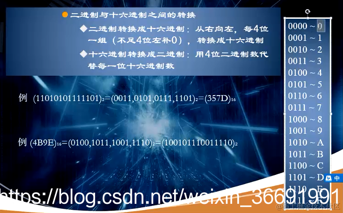 十六进制转换成二进制:用4位二进制数代替每一位十六进制数(如图所示)