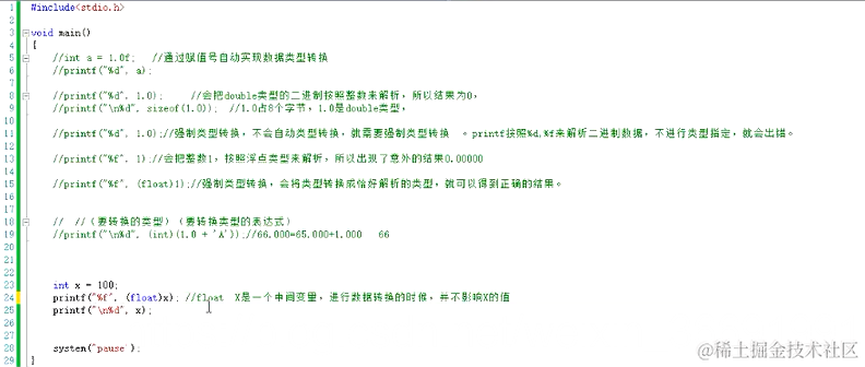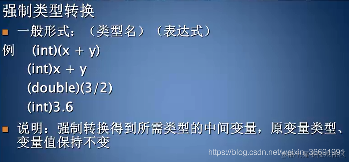 类型转化 AI搬运工 2022-11-01 42 阅读1分钟 强制类型转换: 强制类型转换代码实现以及注释 2、强制类型转换图示讲解 备注:强制转换得到所需类型的中间变量,原变量类型、变量值保持不变 高类型向低类型转化时可能发生精度损失 强制类型转换精度随时代码部分 数据溢出