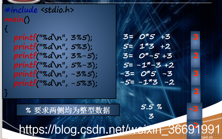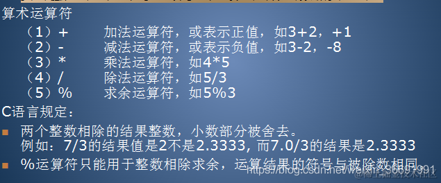 两个整数相除的结果整数,小数部分被舍去。%运算符只能用于整数相除求余,运算结果的符号与被除数相同。