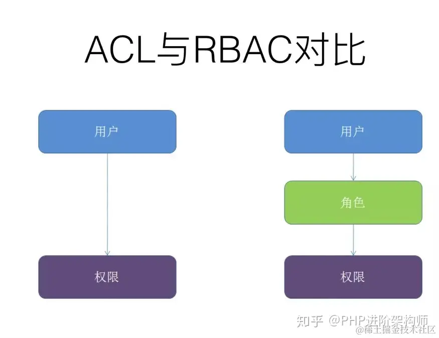 从上图我们可以看出,ACL是用户和权限直接关系的,而RBAC则是通过角色间接关联用户和权限的。所以我们注意到角色是RBAC系统的一个重要属性。