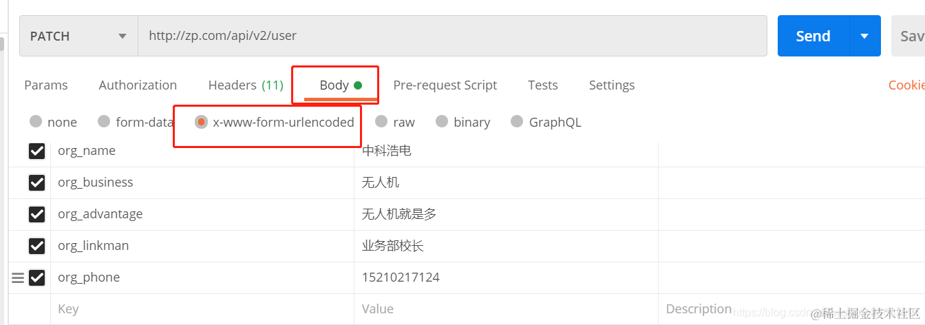 在使用postman请求接口得时候,使用get,post得时候我们是使用body下form-data来传输数据得,但是使用patch时候就不是了,默认是以x-www-form-urlencoded的contentType来发送信息,并且信息内容是放在request的body里。