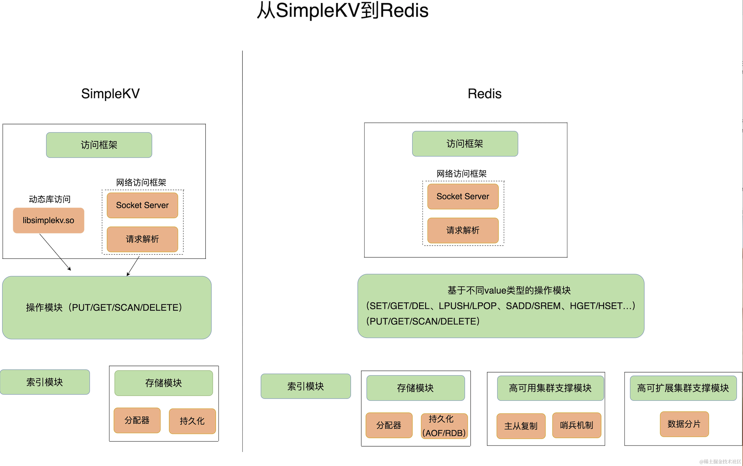 从这张对比图中,我们可以看到,从SimpleKV演进到Redis,有以下几个重要变化: