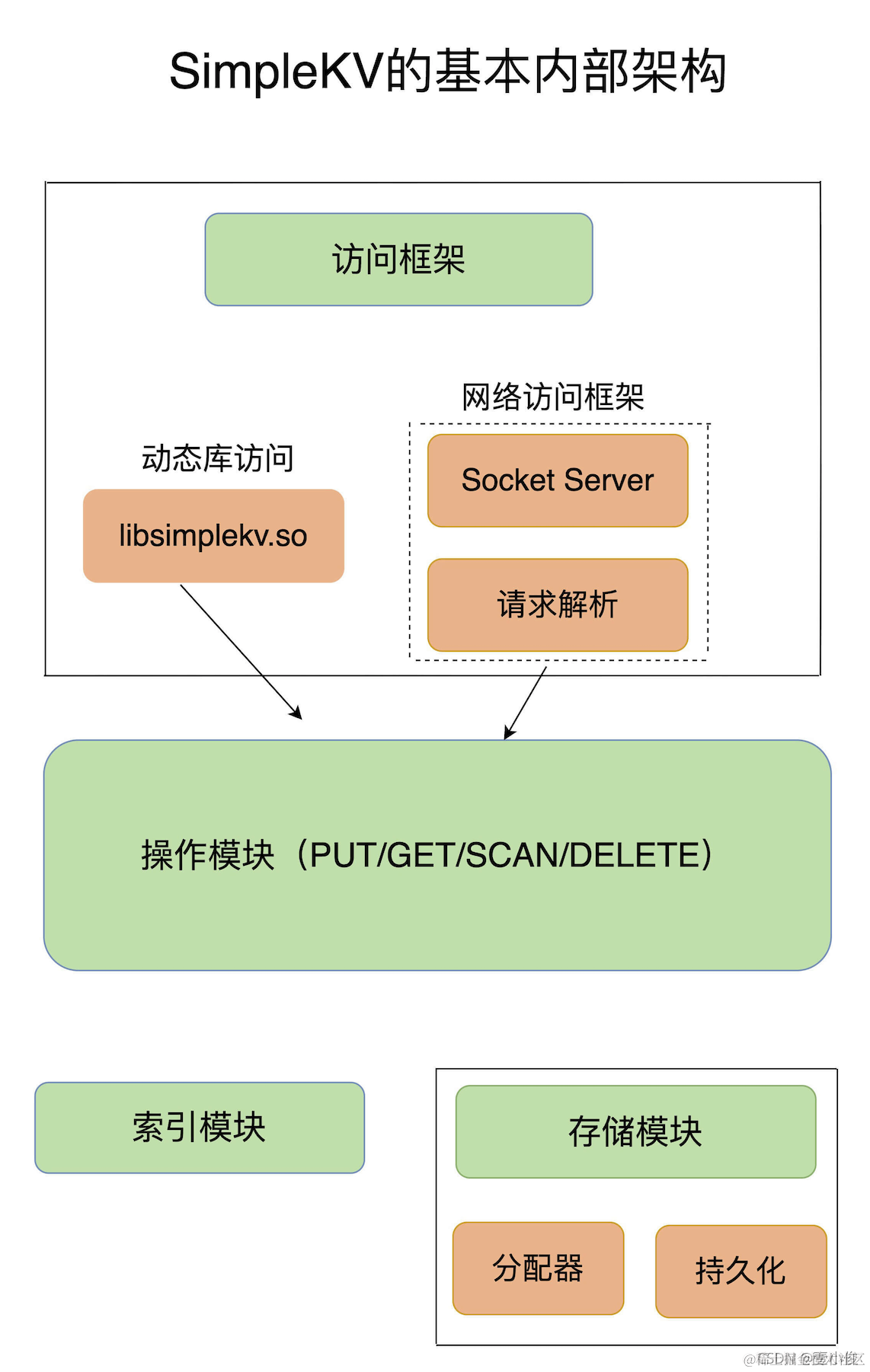 大体来说,一个键值数据库包括了访问框架、索引模块、操作模块和存储模块四部分(见下图)。接下来,我们就从这四个部分入手,继续构建我们的SimpleKV。
