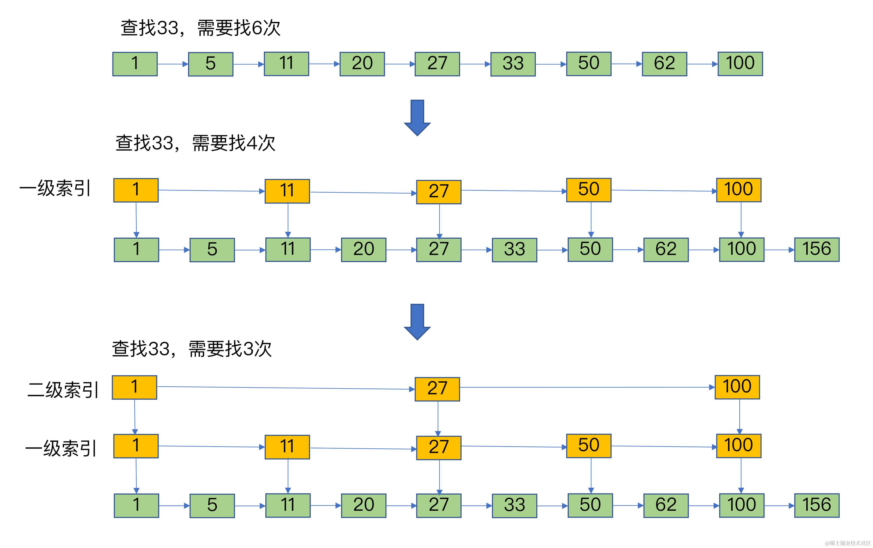 如果我们还想再快,可以再增加二级索引:从一级索引中,再抽取部分元素作为二级索引。例如,从一级索引中抽取1、27、100作为二级索引,二级索引指向一级索引。这样,我们只需要3次查找,就能定位到元素33了。