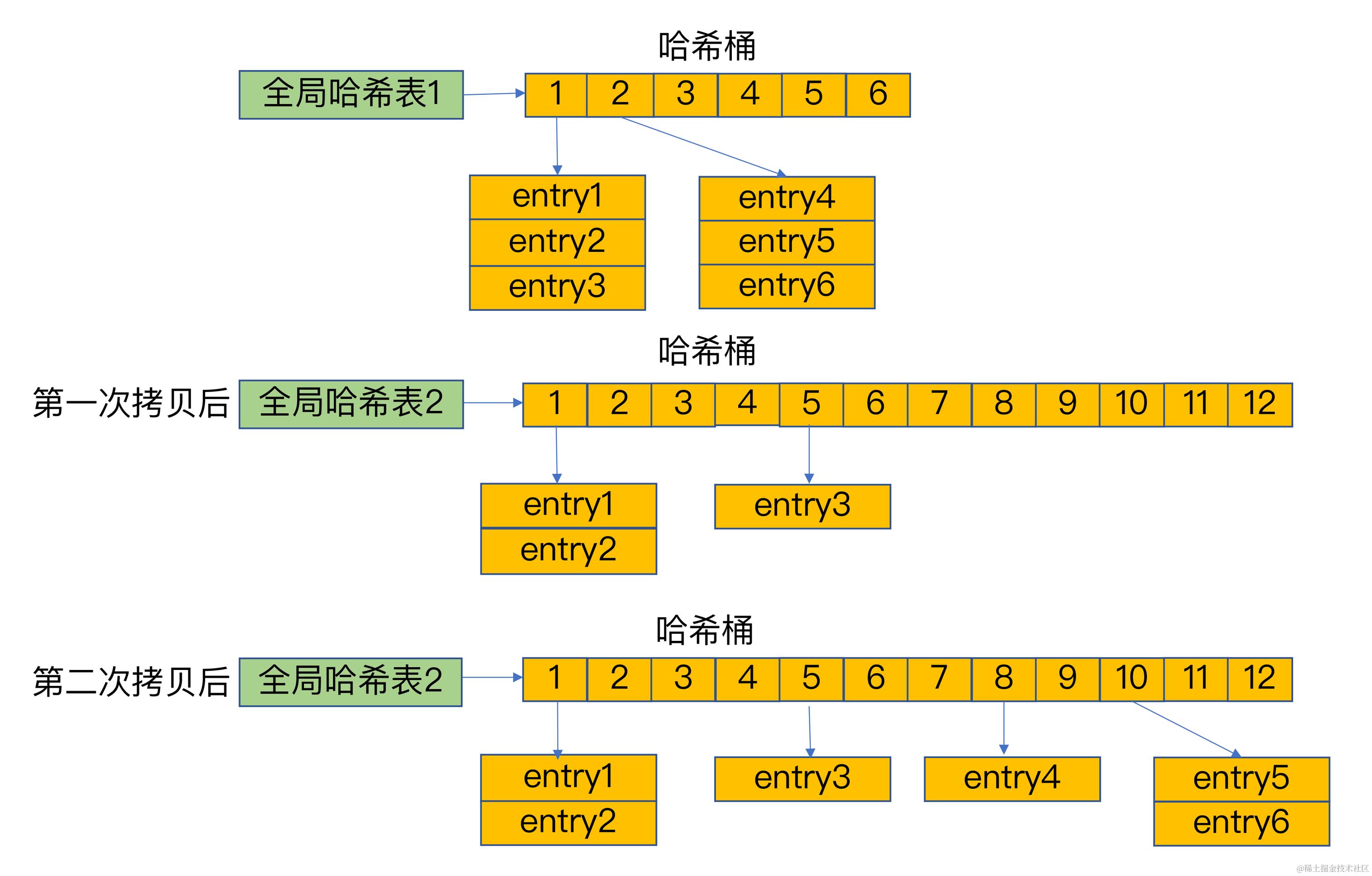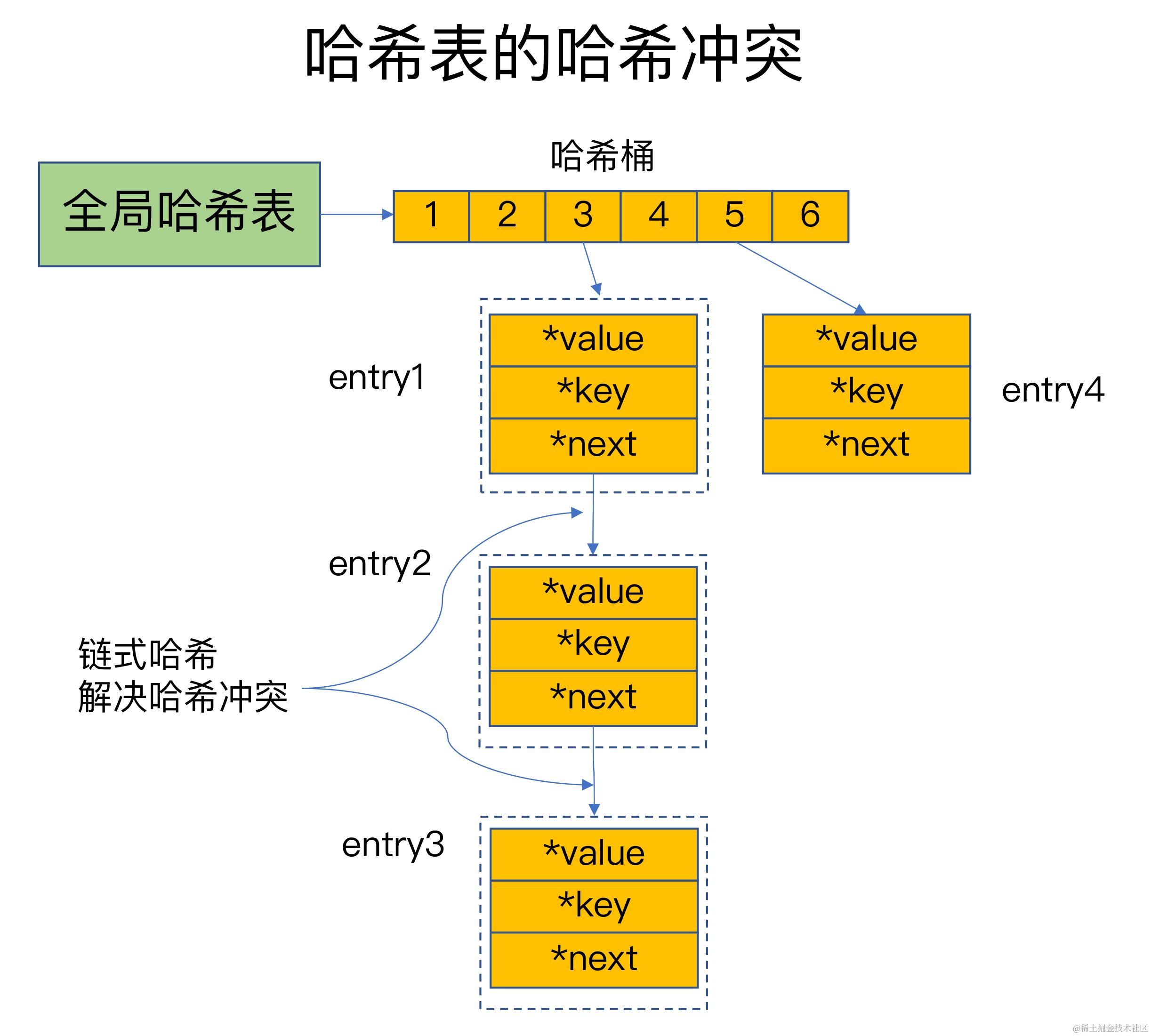 如下图所示:entry1、entry2和entry3都需要保存在哈希桶3中,导致了哈希冲突。此时,entry1元素会通过一个*next指针指向entry2,同样,entry2也会通过*next指针指向entry3。这样一来,即使哈希桶3中的元素有100个,我们也可以通过entry元素中的指针,把它们连起来。这就形成了一个链表,也叫作哈希冲突链。