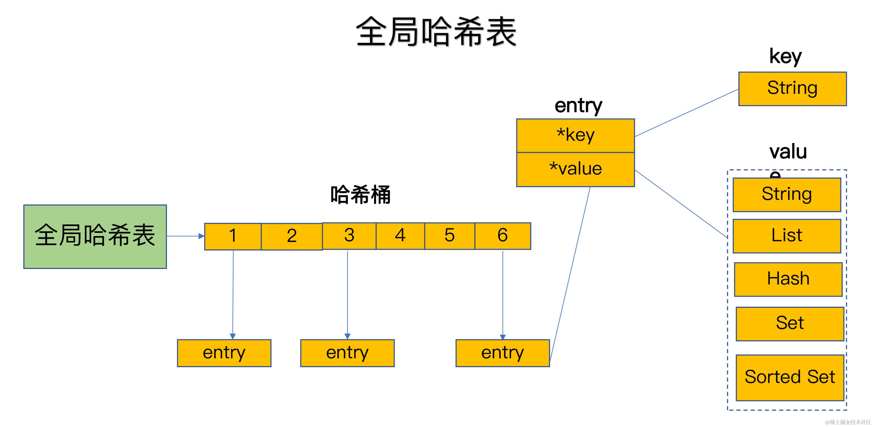 在下图中,可以看到,哈希桶中的entry元素中保存了*key和*value指针,分别指向了实际的键和值,这样一来,即使值是一个集合,也可以通过*value指针被查找到。