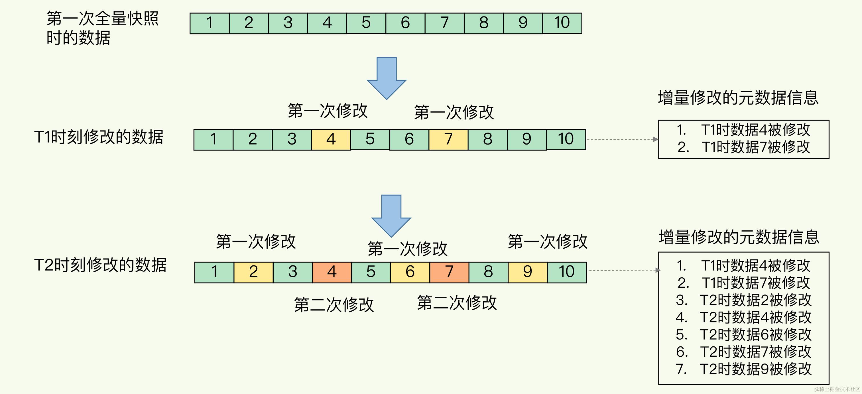 在第一次做完全量快照后,T1和T2时刻如果再做快照,我们只需要将被修改的数据写入快照文件就行。但是,这么做的前提是,我们需要记住哪些数据被修改了。你可不要小瞧这个“记住”功能,它需要我们使用额外的元数据信息去记录哪些数据被修改了,这会带来额外的空间开销问题。如下图所示: