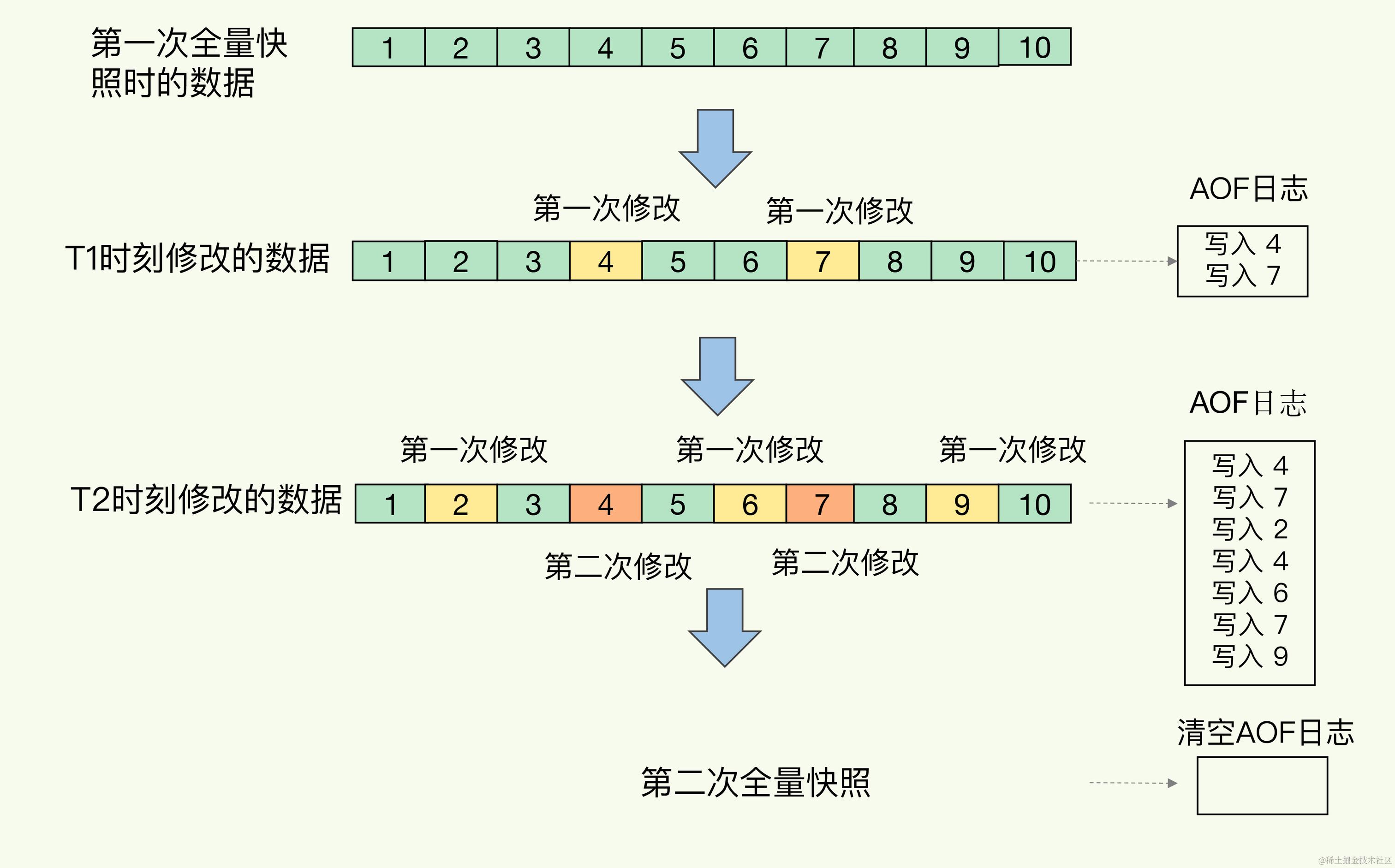 如下图所示,T1和T2时刻的修改,用AOF日志记录,等到第二次做全量快照时,就可以清空AOF日志,因为此时的修改都已经记录到快照中了,恢复时就不再用日志了。