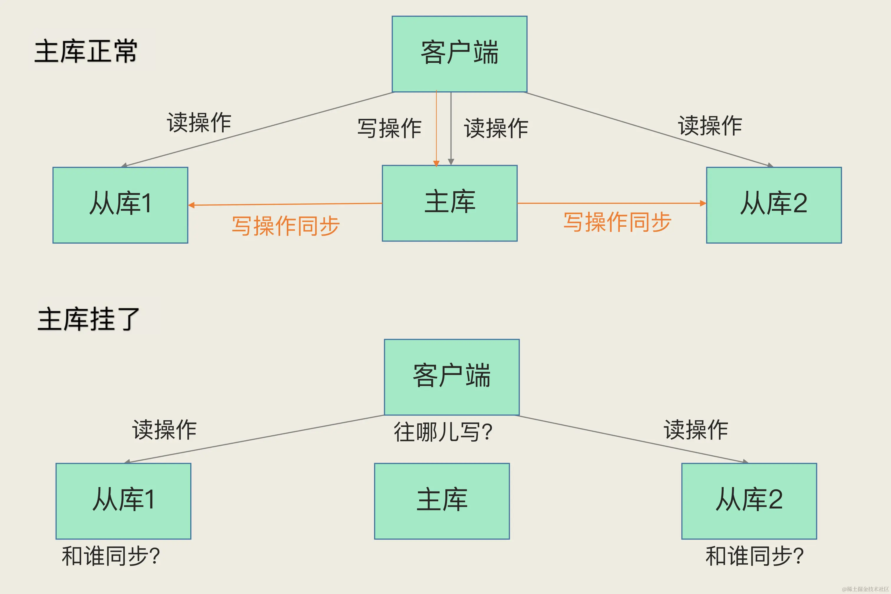 无论是写服务中断,还是从库无法进行数据同步,都是不能接受的。所以,如果主库挂了,我们就需要运行一个新主库,比如说把一个从库切换为主库,把它当成主库。这就涉及到三个问题: