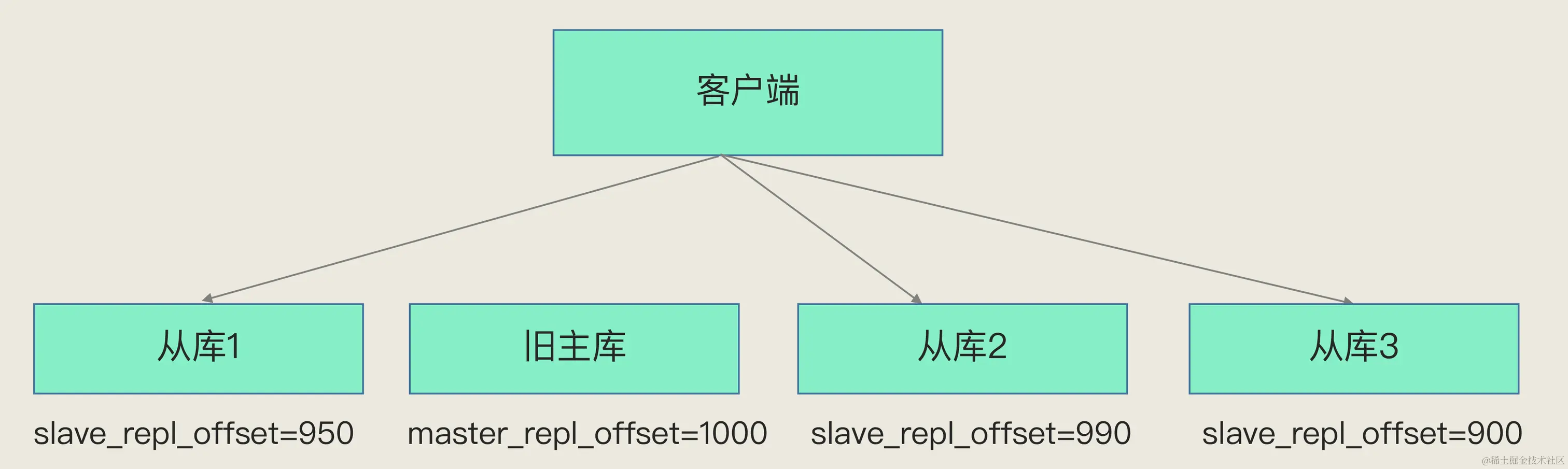 就像下图所示,旧主库的master_repl_offset是1000,从库1、2和3的slave_repl_offset分别是950、990和900,那么,从库2就应该被选为新主库。