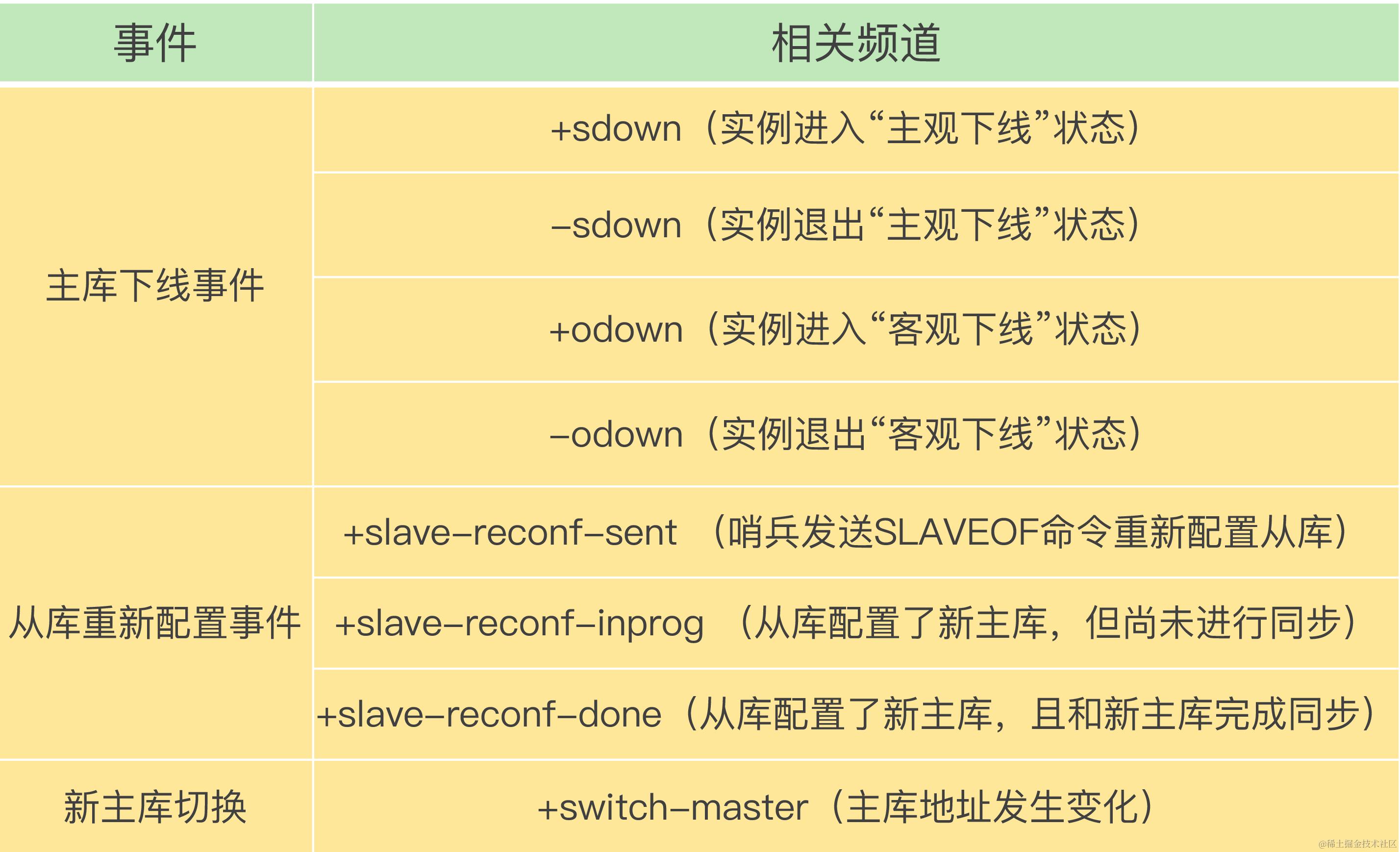 频道有这么多,一下子全部学习容易丢失重点。为了减轻你的学习压力,我把重要的频道汇总在了一起,涉及几个关键事件,包括主库下线判断、新主库选定、从库重新配置。