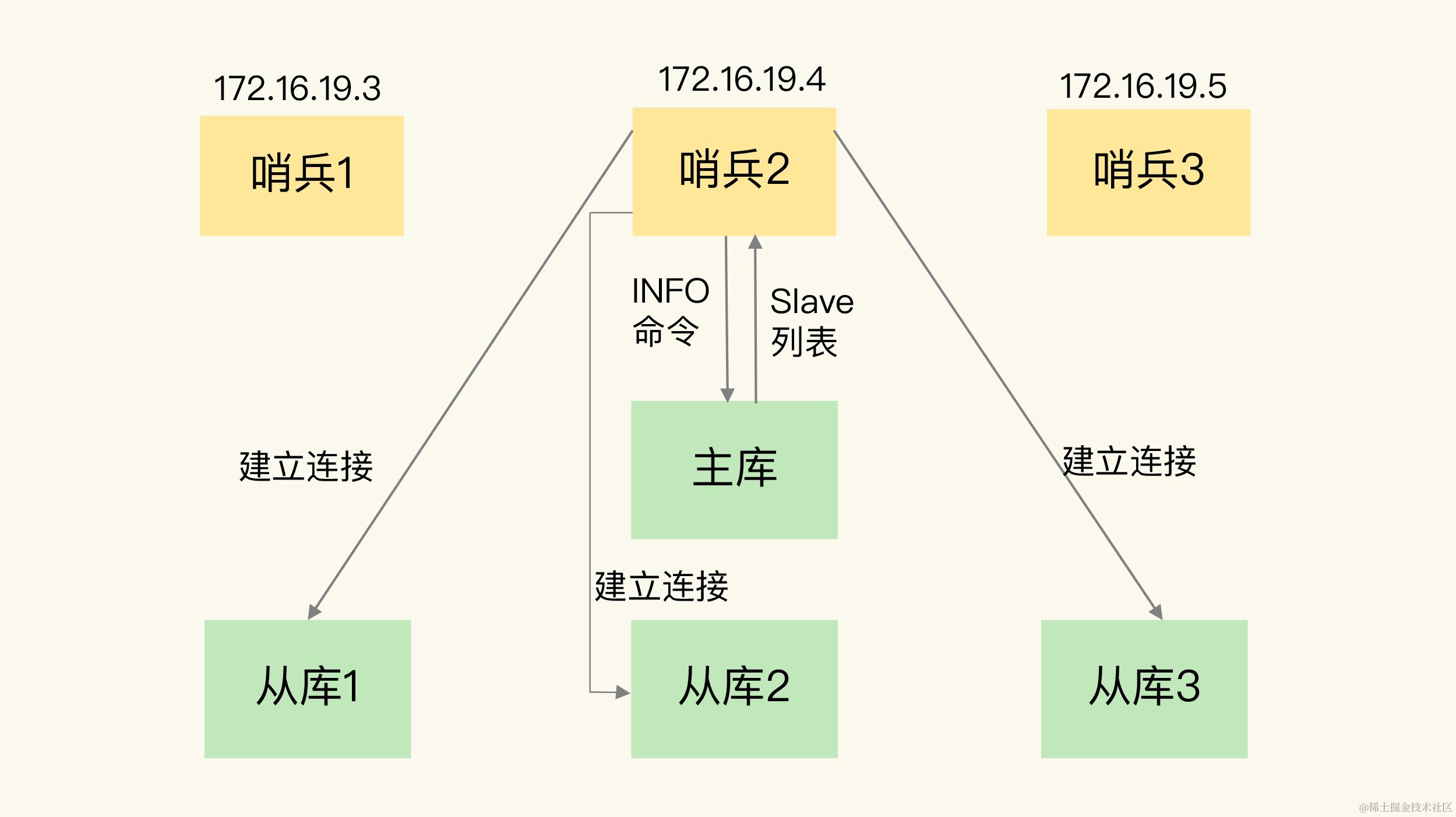 哨兵除了彼此之间建立起连接形成集群外,还需要和从库建立连接。这是因为,在哨兵的监控任务中,它需要对主从库都进行心跳判断,而且在主从库切换完成后,它还需要通知从库,让它们和新主库进行同步。