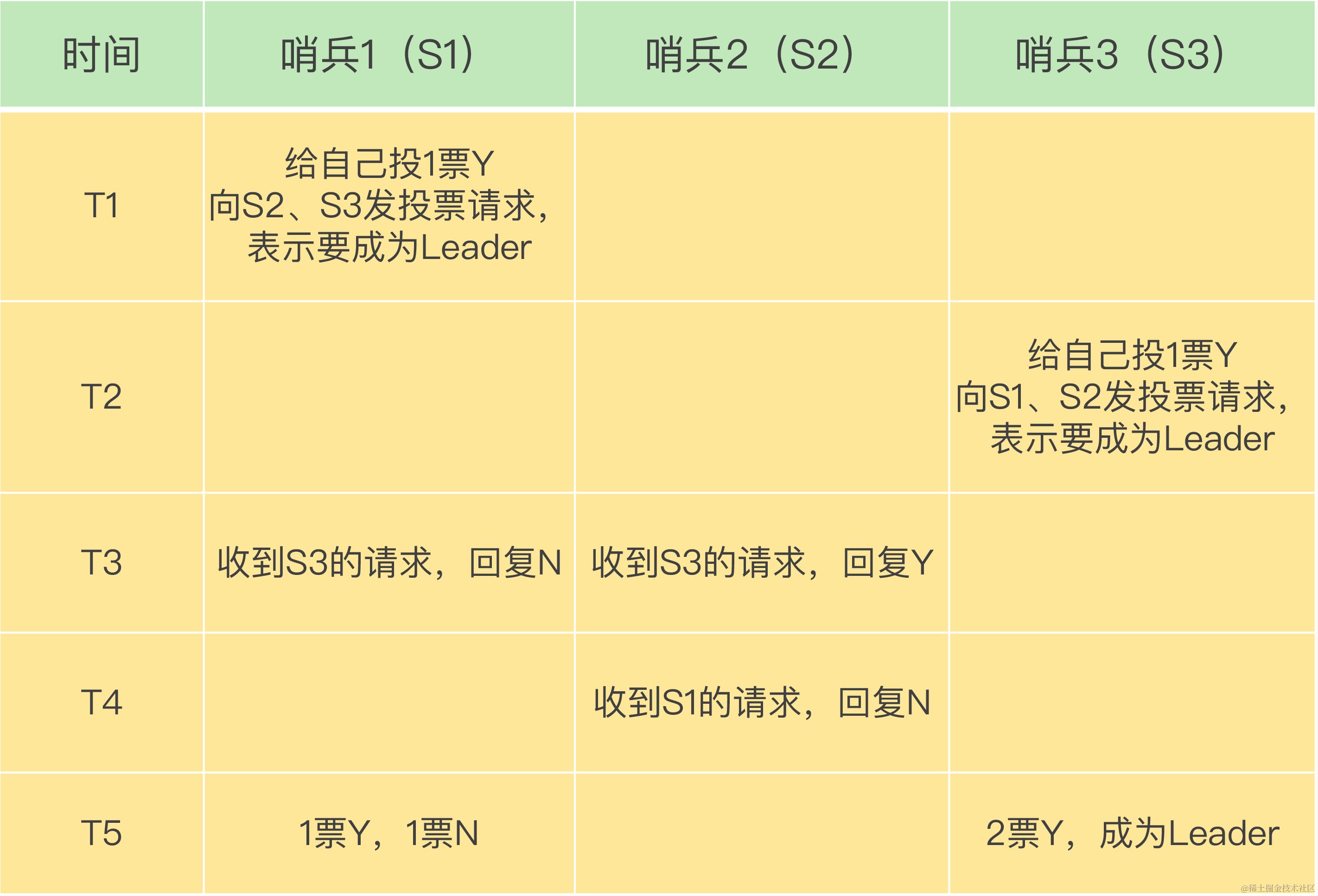 在T3时刻,S1收到了S3的Leader投票请求。因为S1已经给自己投了一票Y,所以它不能再给其他哨兵投赞成票了,所以S1回复N表示不同意。同时,S2收到了T2时S3发送的Leader投票请求。因为S2之前没有投过票,它会给第一个向它发送投票请求的哨兵回复Y,给后续再发送投票请求的哨兵回复N,所以,在T3时,S2回复S3,同意S3成为Leader。