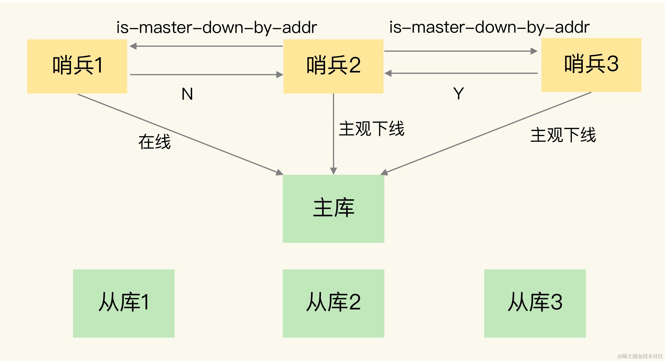 任何一个实例只要自身判断主库“主观下线”后,就会给其他实例发送is-master-down-by-addr命令。接着,其他实例会根据自己和主库的连接情况,做出Y或N的响应,Y相当于赞成票,N相当于反对票。