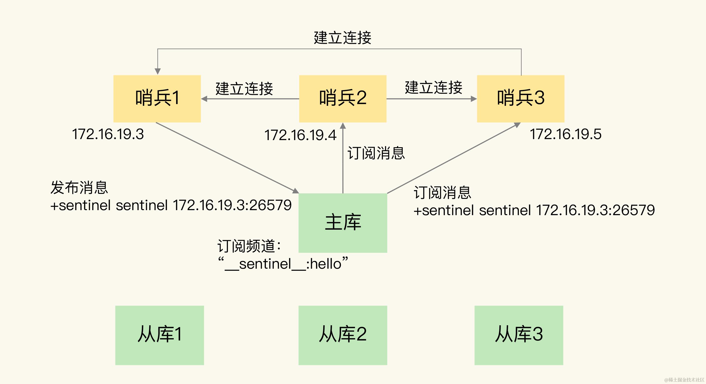 哨兵只要和主库建立起了连接,就可以在主库上发布消息了,比如说发布它自己的连接信息(IP和端口)。同时,它也可以从主库上订阅消息,获得其他哨兵发布的连接信息。当多个哨兵实例都在主库上做了发布和订阅操作后,它们之间就能知道彼此的IP地址和端口。