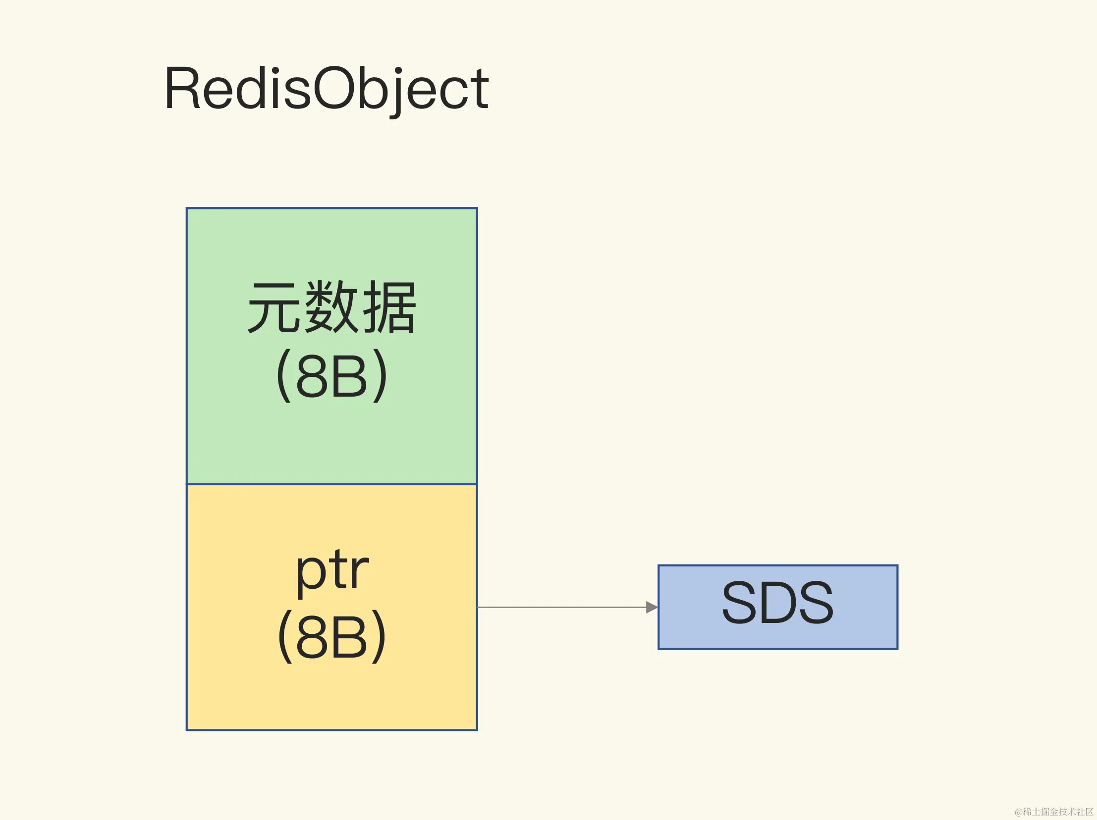 一个RedisObject包含了8字节的元数据和一个8字节指针,这个指针再进一步指向具体数据类型的实际数据所在,例如指向String类型的SDS结构所在的内存地址,可以看一下下面的示意图。关于RedisObject的具体结构细节,我会在后面的课程中详细介绍,现在你只要了解它的基本结构和元数据开销就行了。