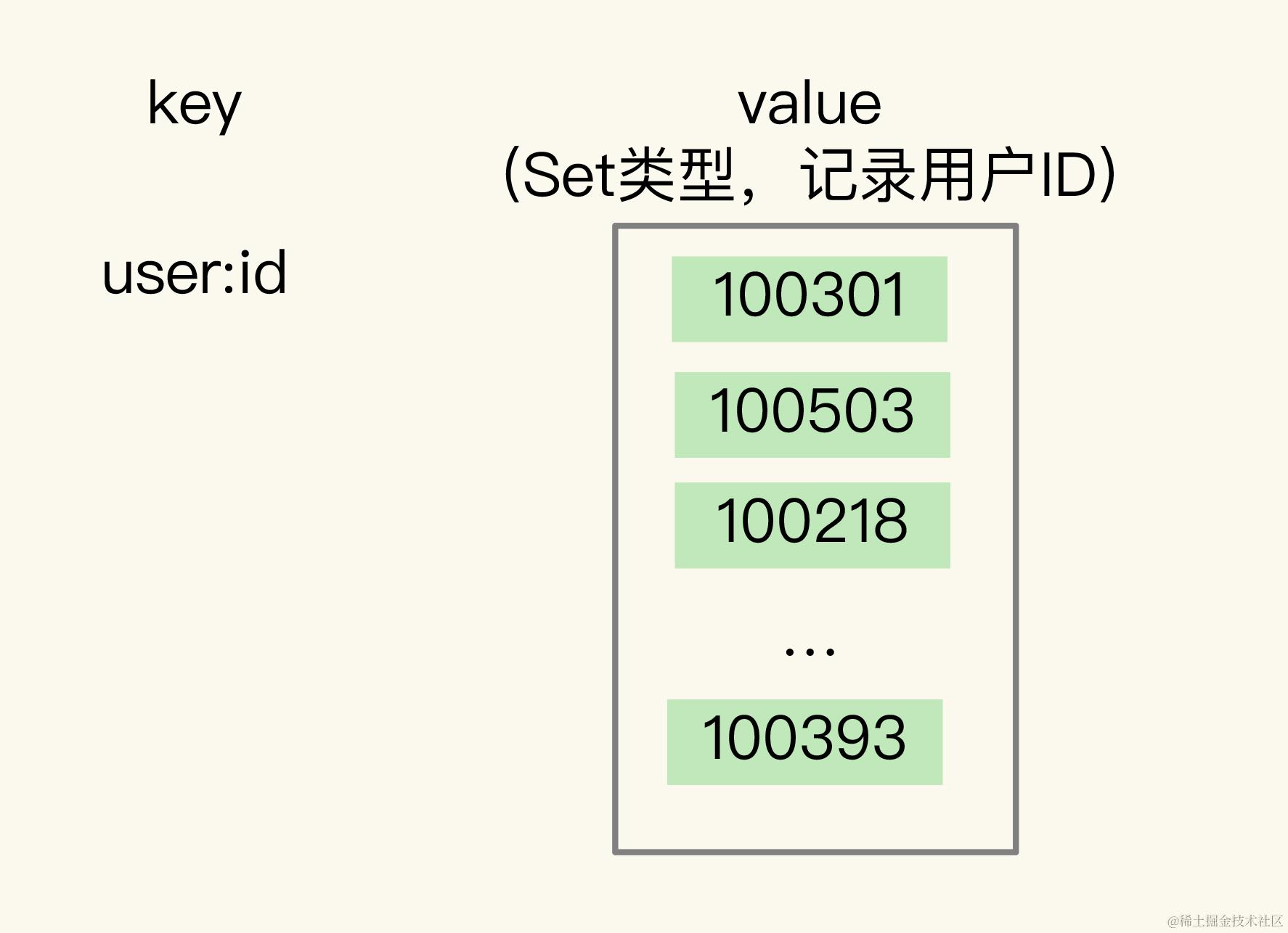 - value是Set集合,记录当天登录的用户ID。