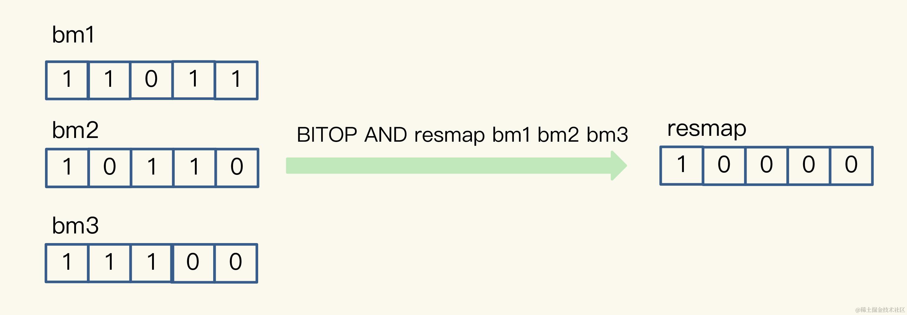 我以按位“与”操作为例来具体解释一下。从下图中,可以看到,三个Bitmap bm1、bm2和bm3,对应bit位做“与”操作,结果保存到了一个新的Bitmap中(示例中,这个结果Bitmap的key被设为“resmap”)。