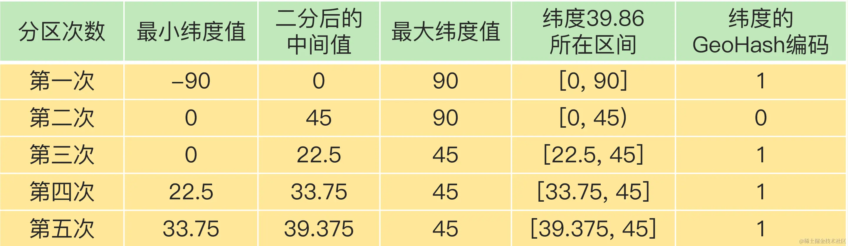 按照这种方法,做完5次分区后,我们把经度值116.37定位在[112.5, 123.75]这个区间,并且得到了经度值的5位编码值,即11010。这个编码过程如下表所示:
