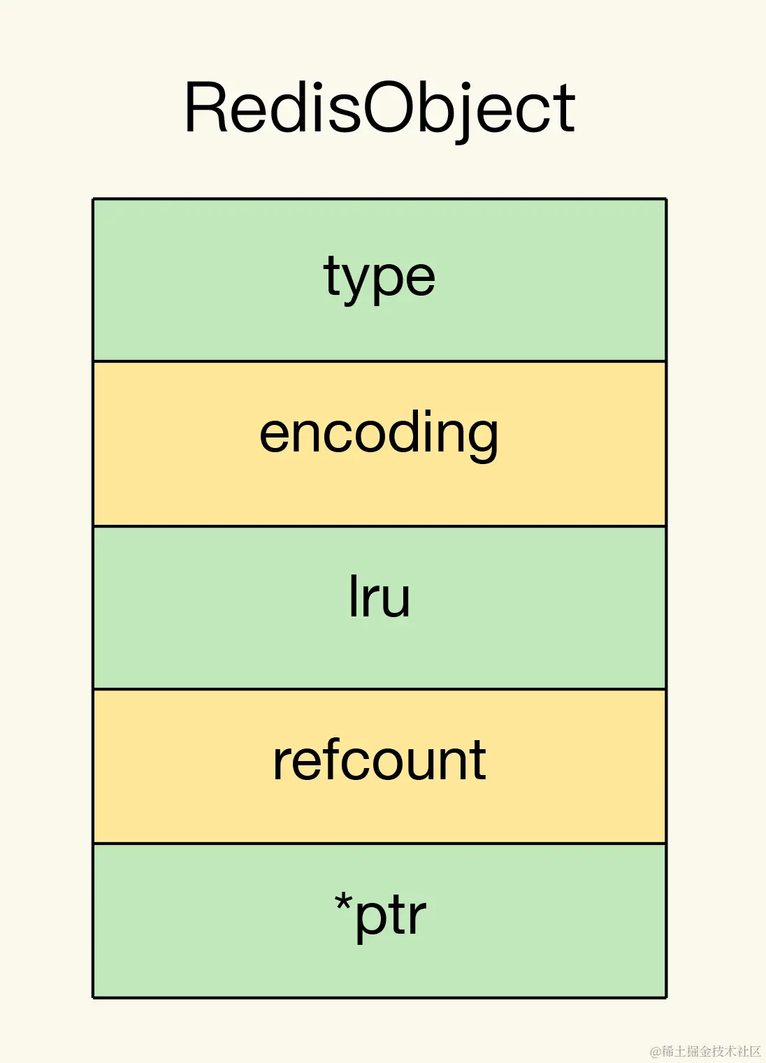 RedisObject的内部组成包括了type,、encoding,、lru和refcount 4个元数据,以及1个*ptr指针。