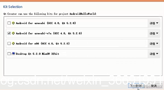 (3)在构建套件中我们选择Android for armeabi-7a(GCC 4.8 Qt 5.2.0)
