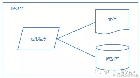 最初业务量不大,访问量小,此时的架构,应用程序、数据库、文件都部署在一台服务器上,有些甚至仅仅是租用主机空间